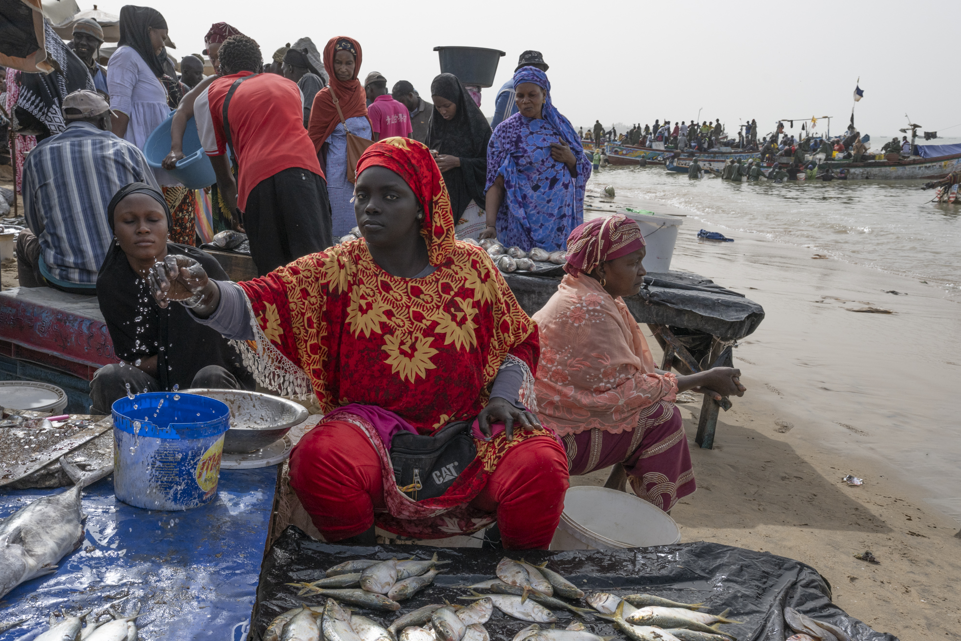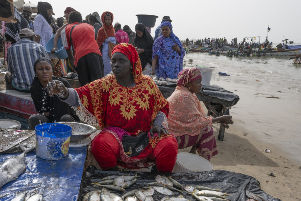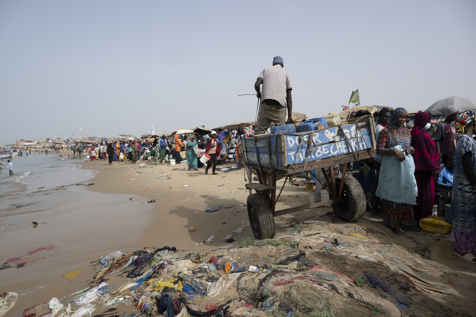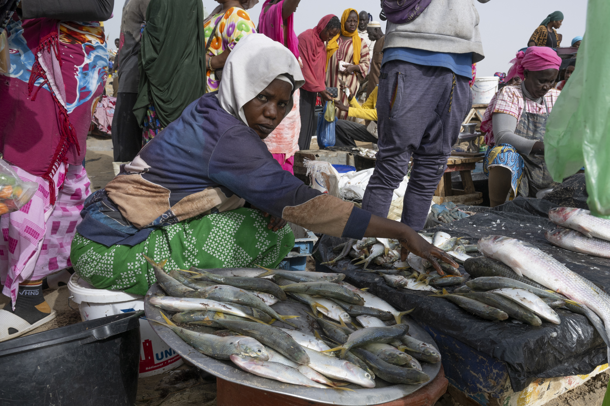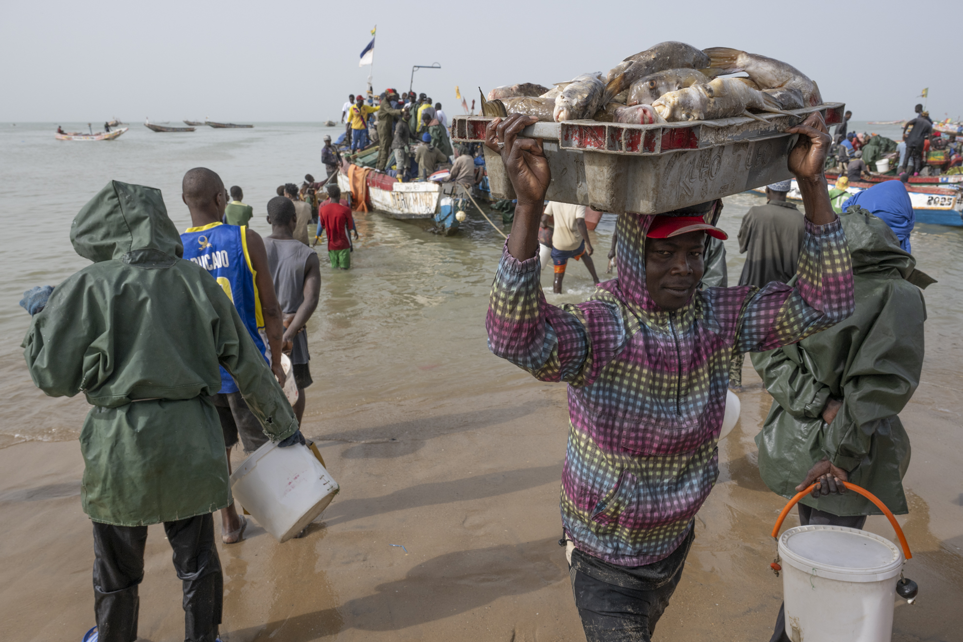 Certaines négocient, d’autres transportent les prises dans de grandes bassines posées sur la tête. Le sable devient un marché vivant où chaque pas, chaque cri, chaque rire participe à un ballet collectif.