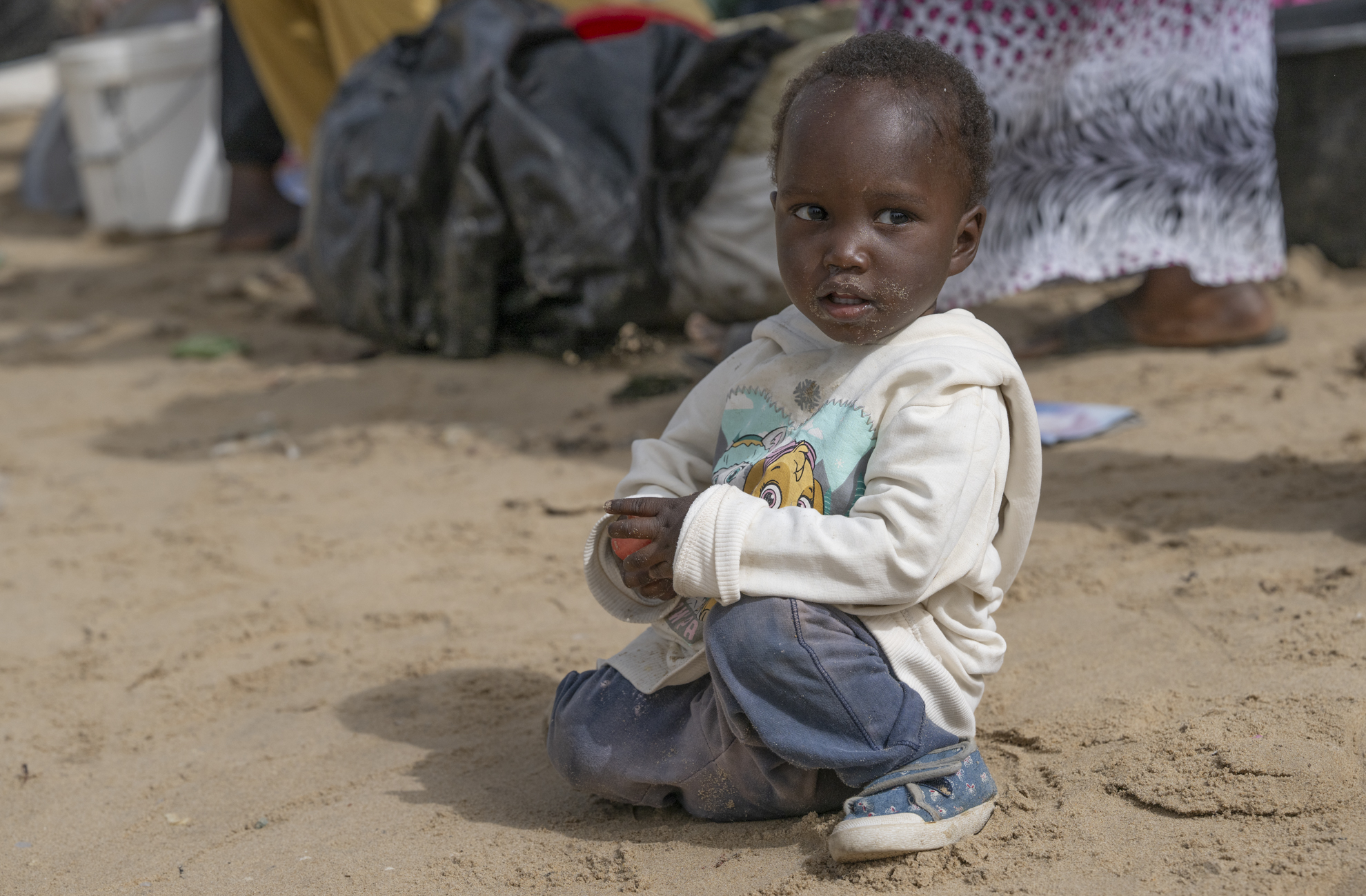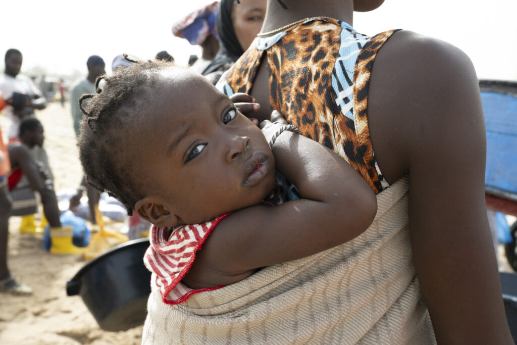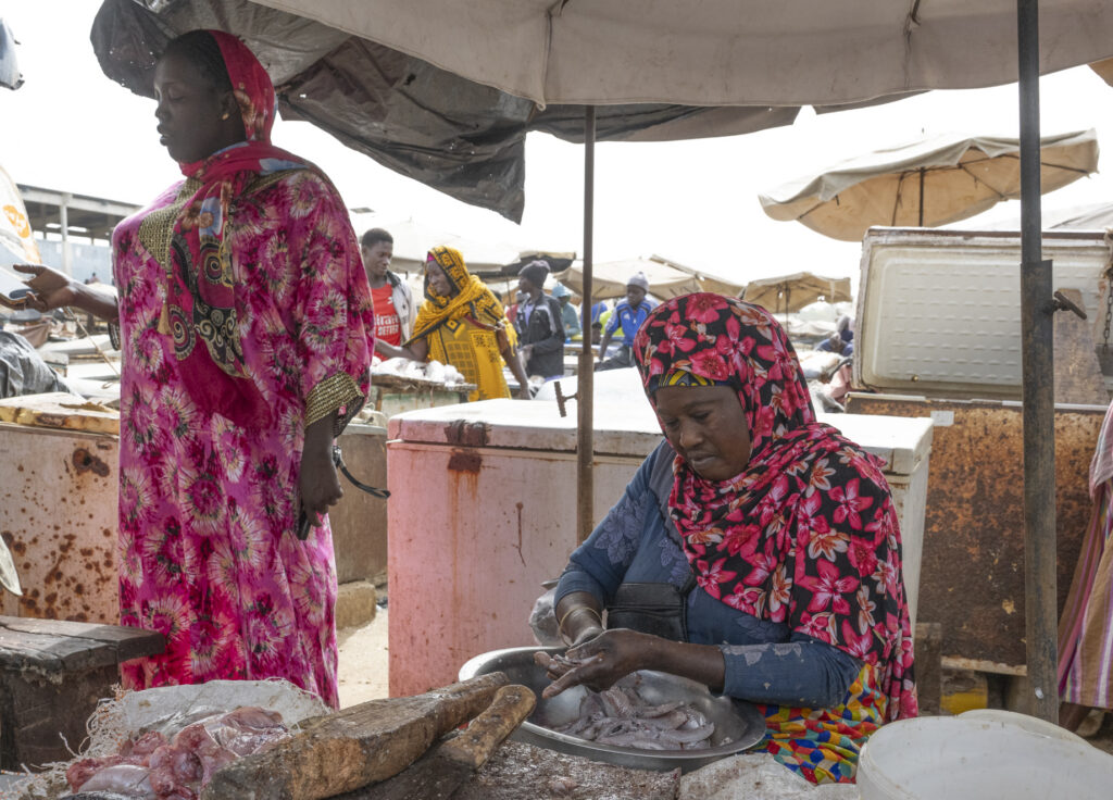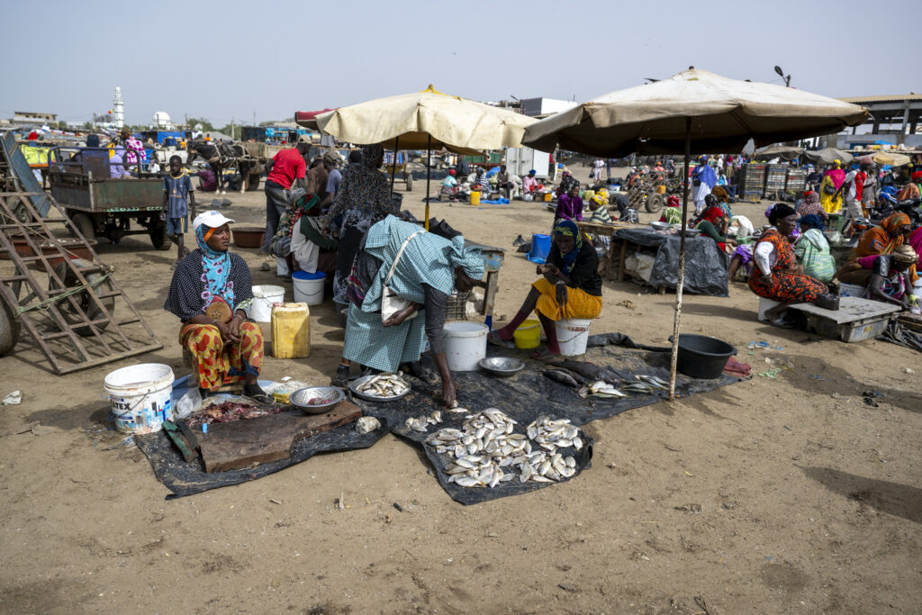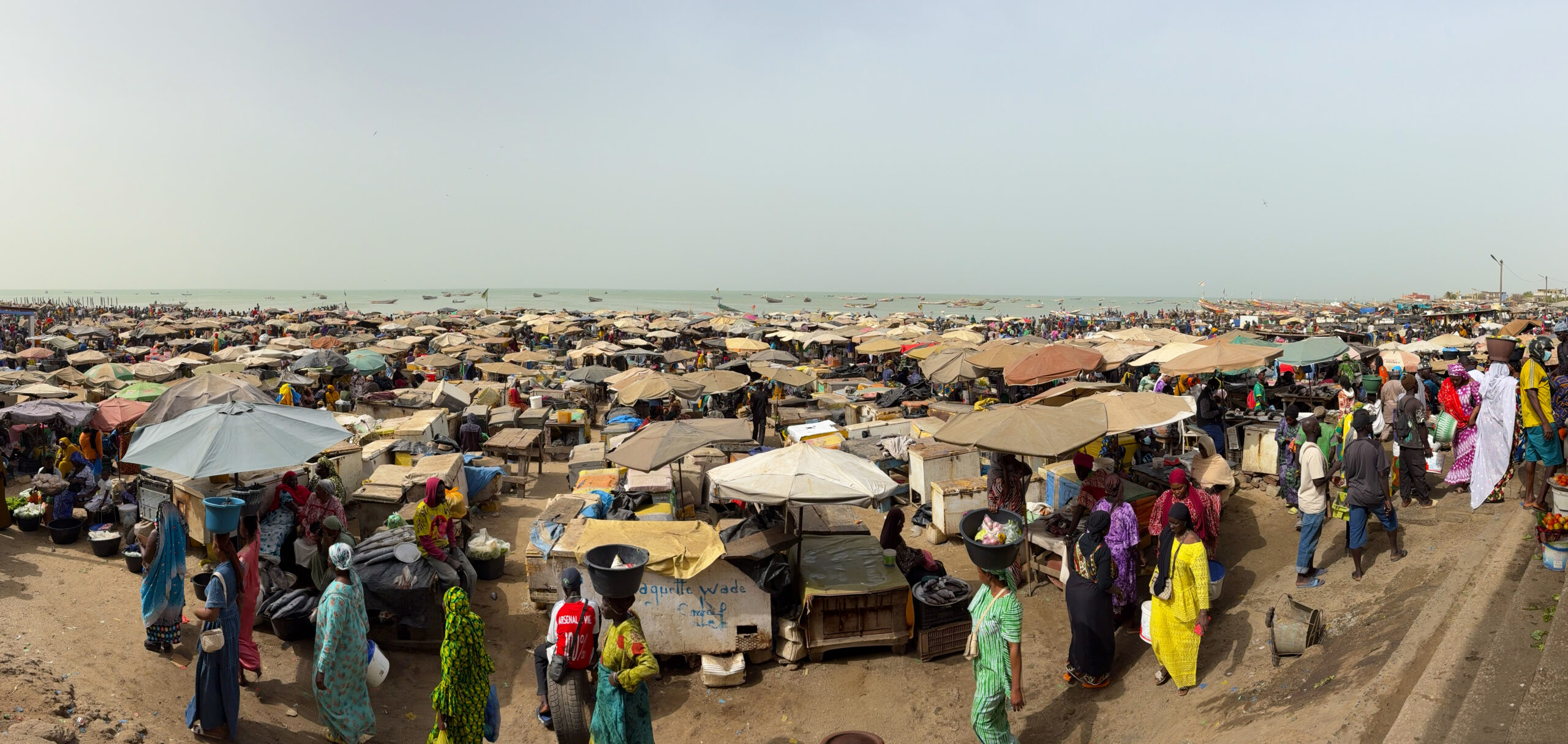 Certaines négocient, d’autres transportent les prises dans de grandes bassines posées sur la tête. Le sable devient un marché vivant où chaque pas, chaque cri, chaque rire participe à un ballet collectif.